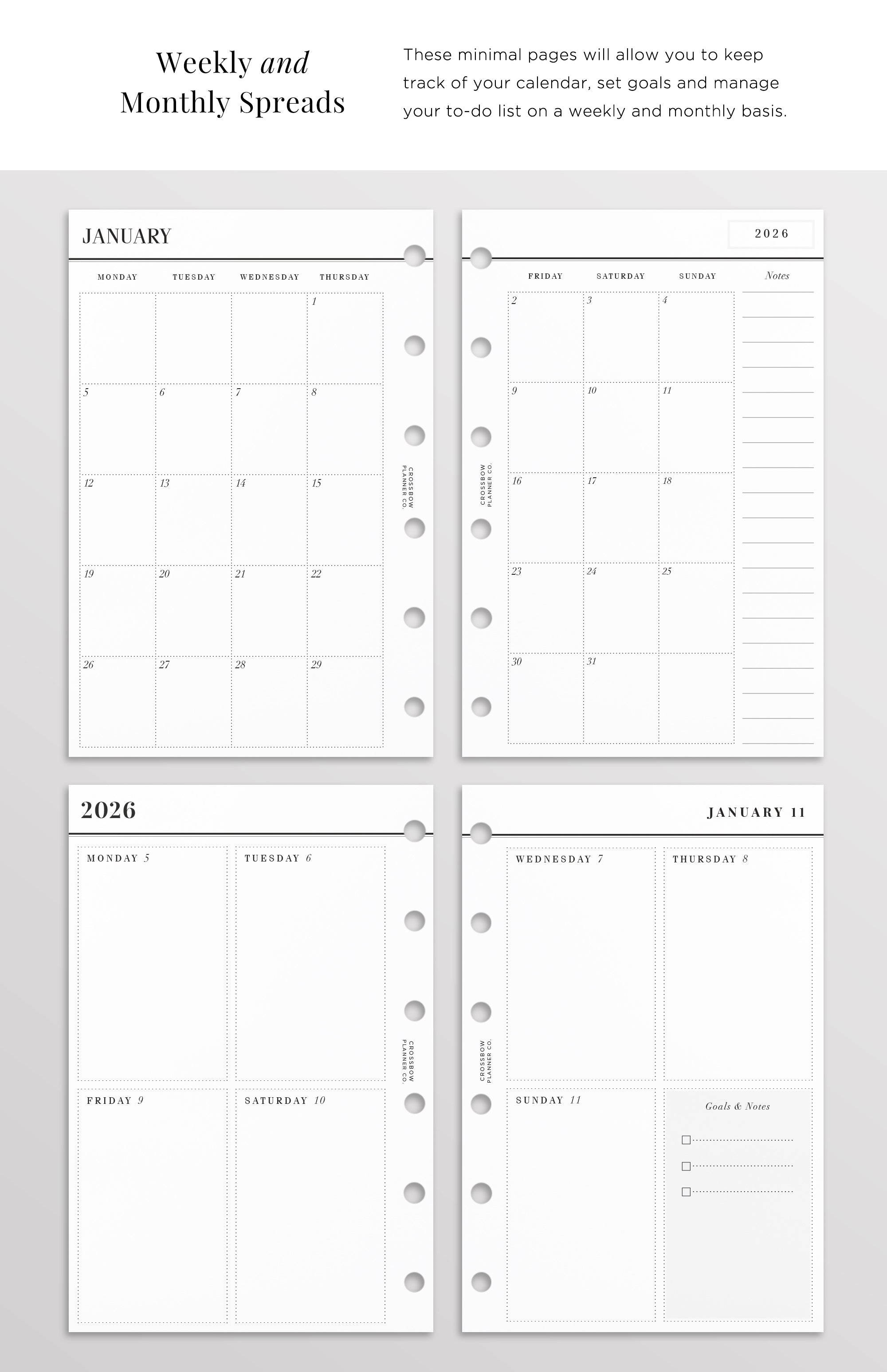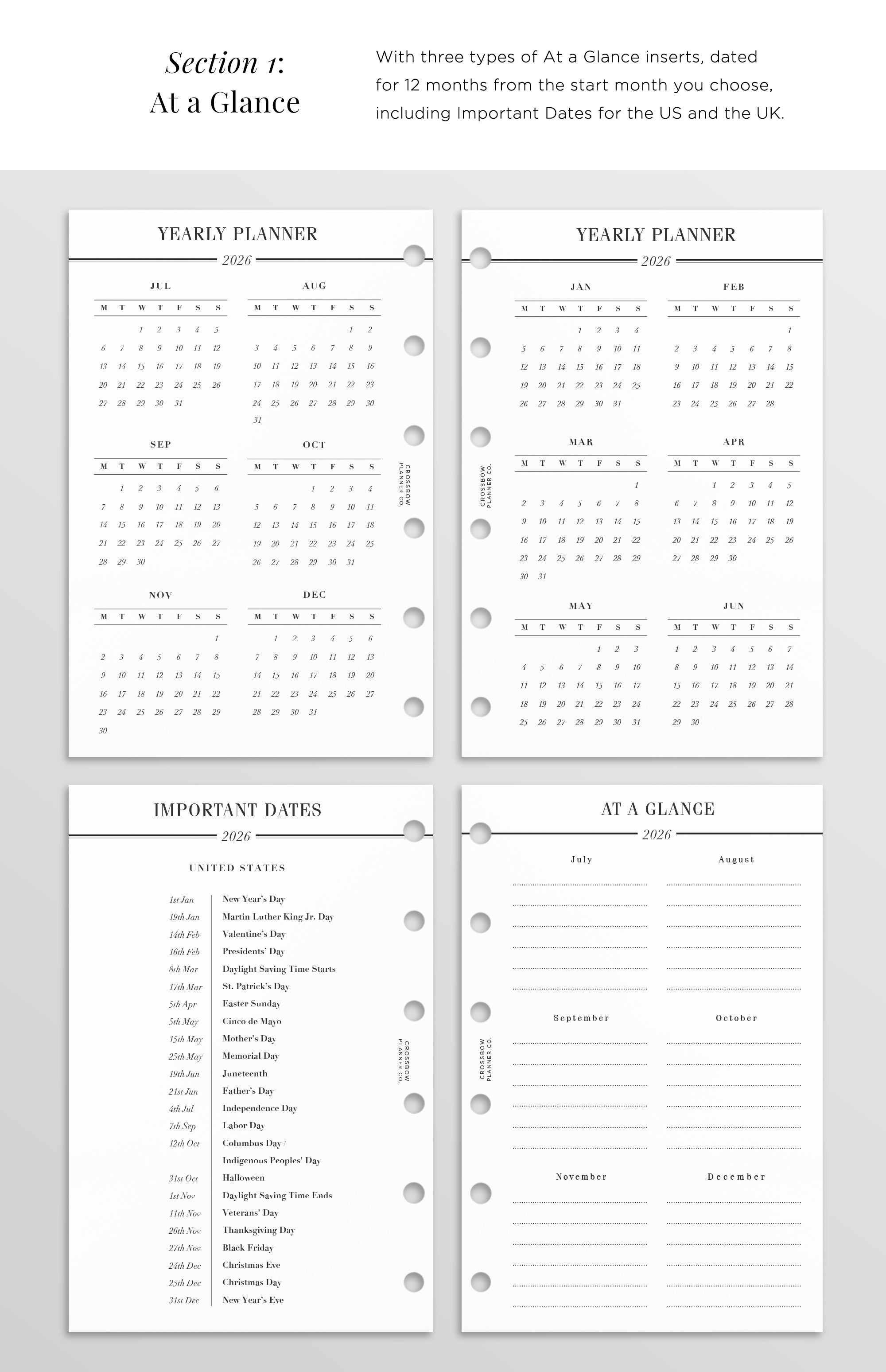 Not sure which 2026 planner inserts are right for you? View our 2026 Collection Guide here to find your perfect match. With Yearly Planner inserts, Weekly Inserts, Monthly Inserts, Daily inserts and 2026 planner accessories, there's something for everyone. Our minimal planner refills are available in A5, Personal Size and Pocket Size, making them the ideal option for your Filofax, Louis Vuitton Agenda or other 6-ring planner.