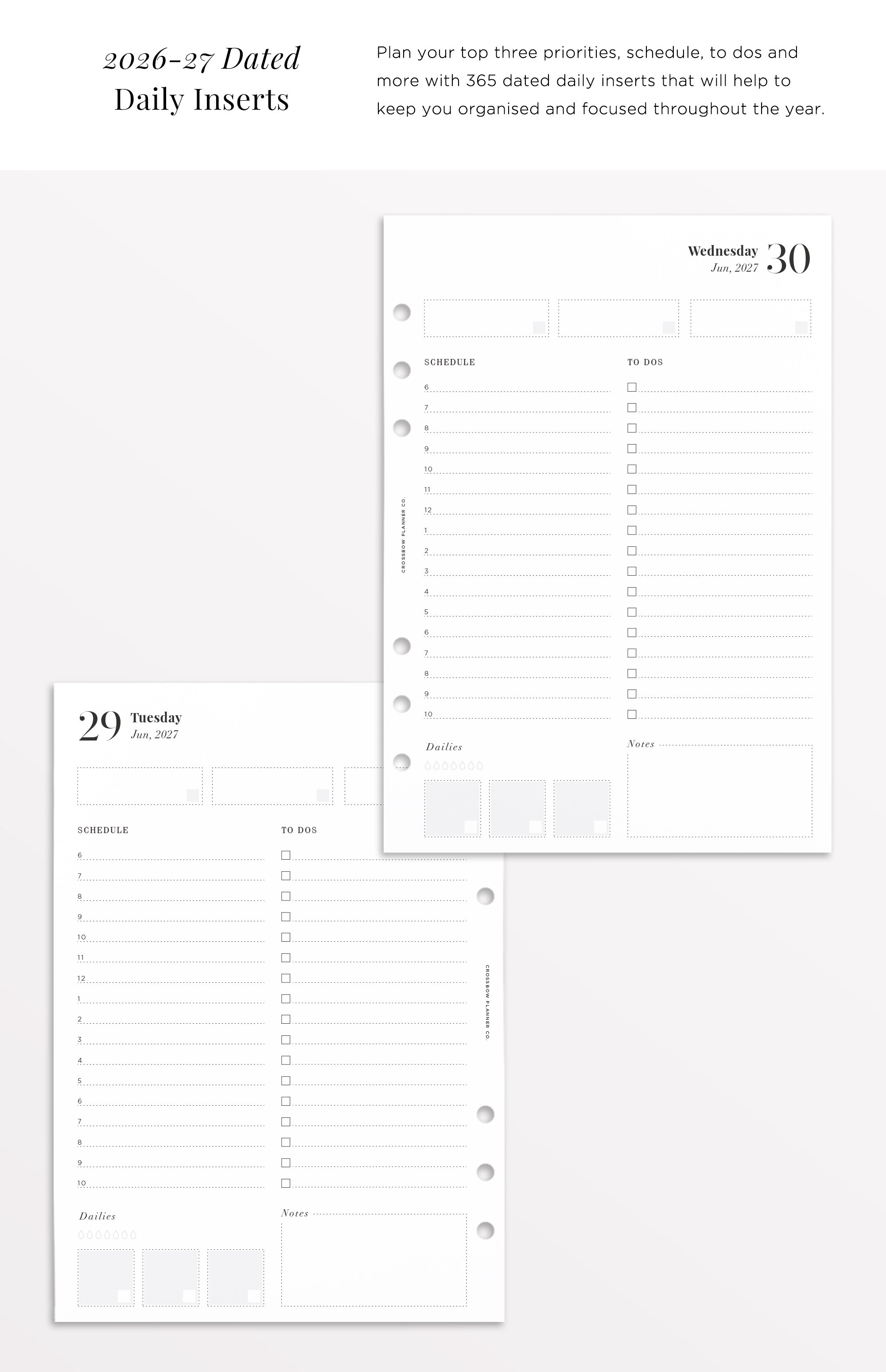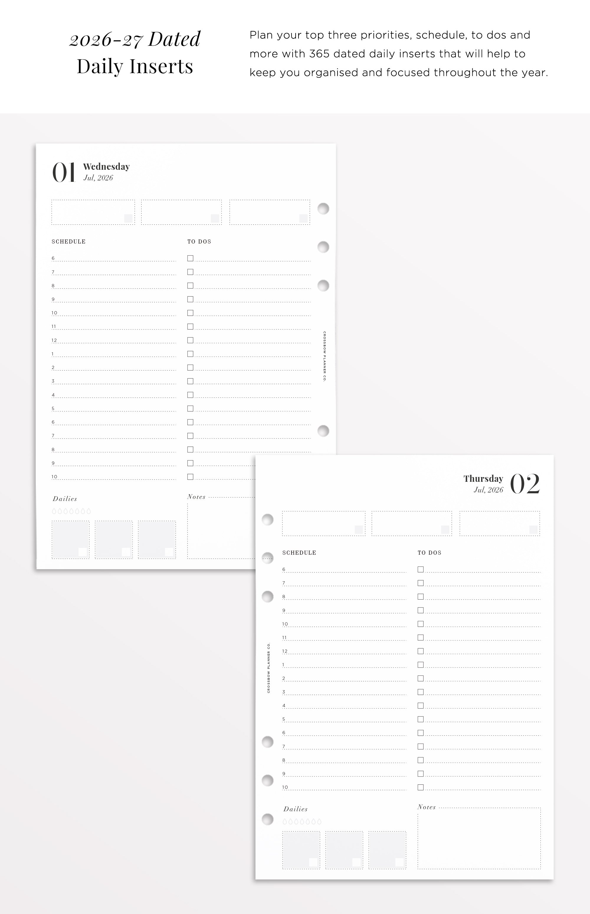 Introducing the A5 2026-2027 daily dated planner inserts; the perfect companion to help you manage your day to day from July 2026 - June 2027. Including over 380 pages, this planner has all the right prompts to help you stay productive and effective throughout the year, and is perfect for lovers of minimal design.