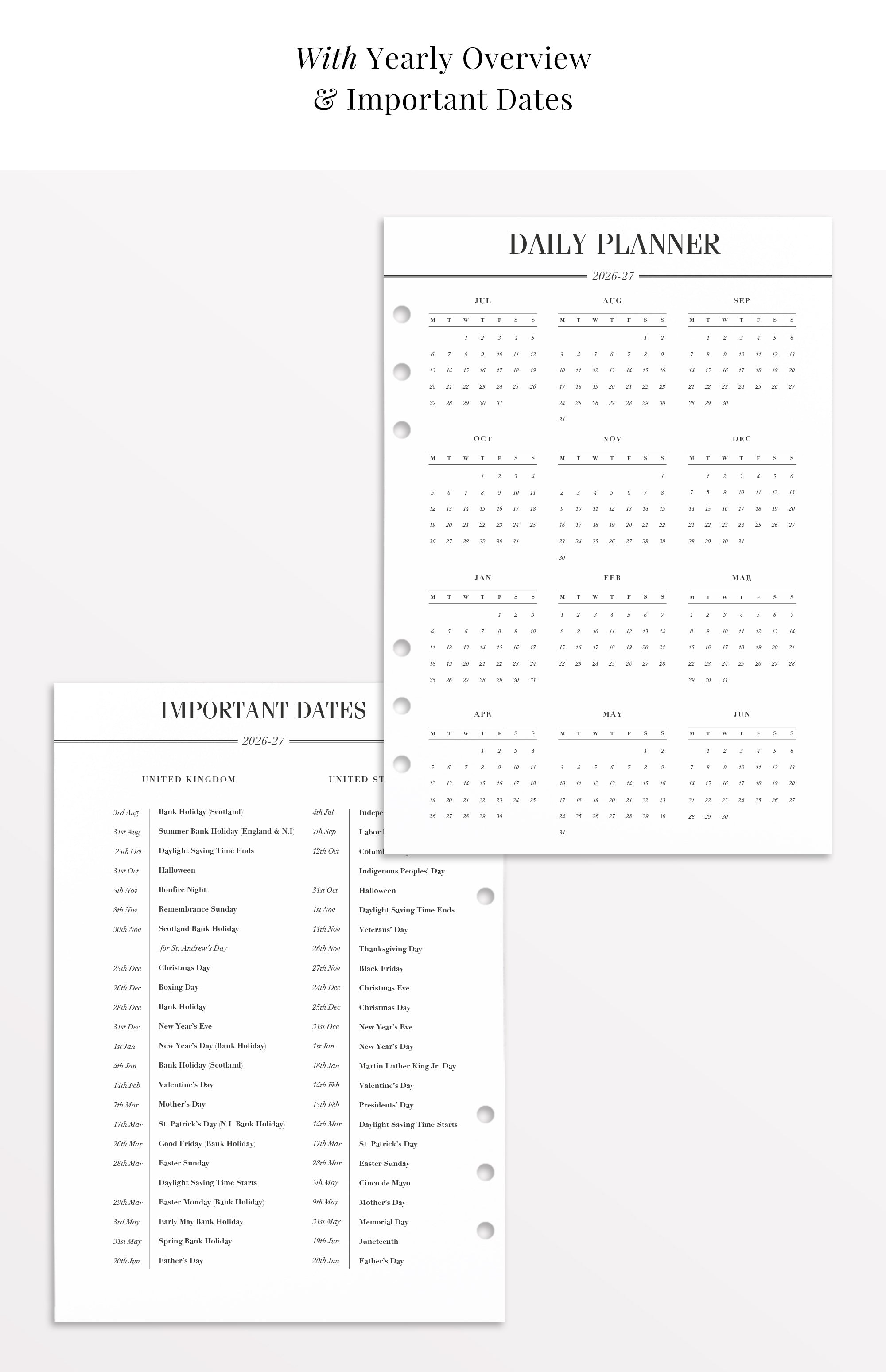 Each month is separable (can be used with monthly dividers) and begins with a cover page to help you get an overview of your monthly calendar and keep track of monthly appointments or goals. Throughout the planner you will find some motivational quotes, as well as a Yearly Overview and Important Dates list. Used daily and intentionally, you'll be sure to achieve more than you ever thought possible with the 2026-2027 daily planner inserts.