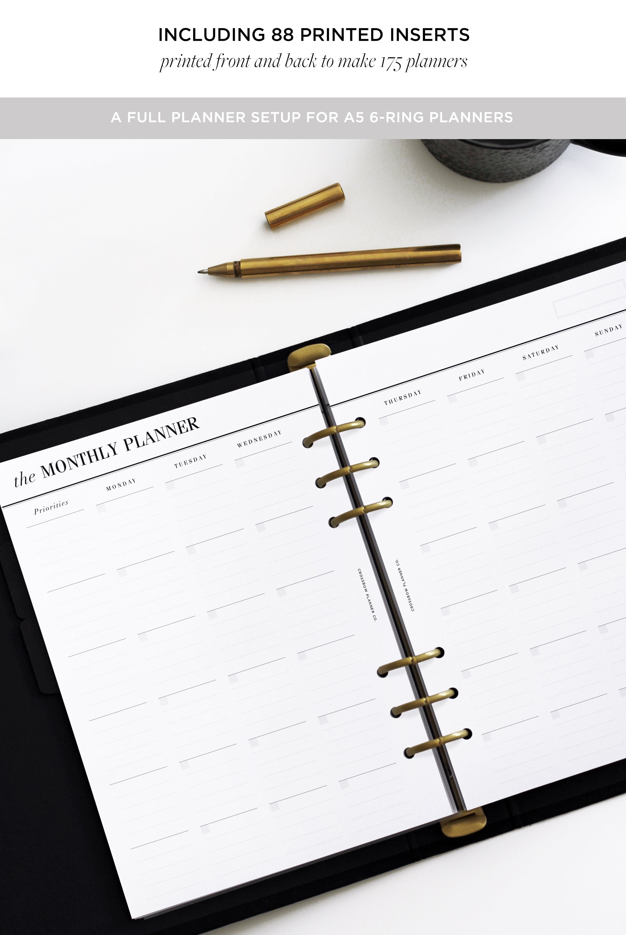 Your planner refills should be as beautiful as the cover that holds them. We're on a mission to bring quality to your daily planning routine, with thick, fountain-pen friendly pages, minimal design and effective planning systems for every area of your life. Our range of A5 Printed Planner Inserts will fit any standard A5 6-ring planner. A5 planner inserts are compatible with planners such as our Crossbow Planner Co. Signature Leather Planner Cover, A5 Filofax and Louis Vuitton Large "GM" Agendas (non-vintage models). Not sure which inserts are right for you? Drop us a line to get a tailored suggestion.