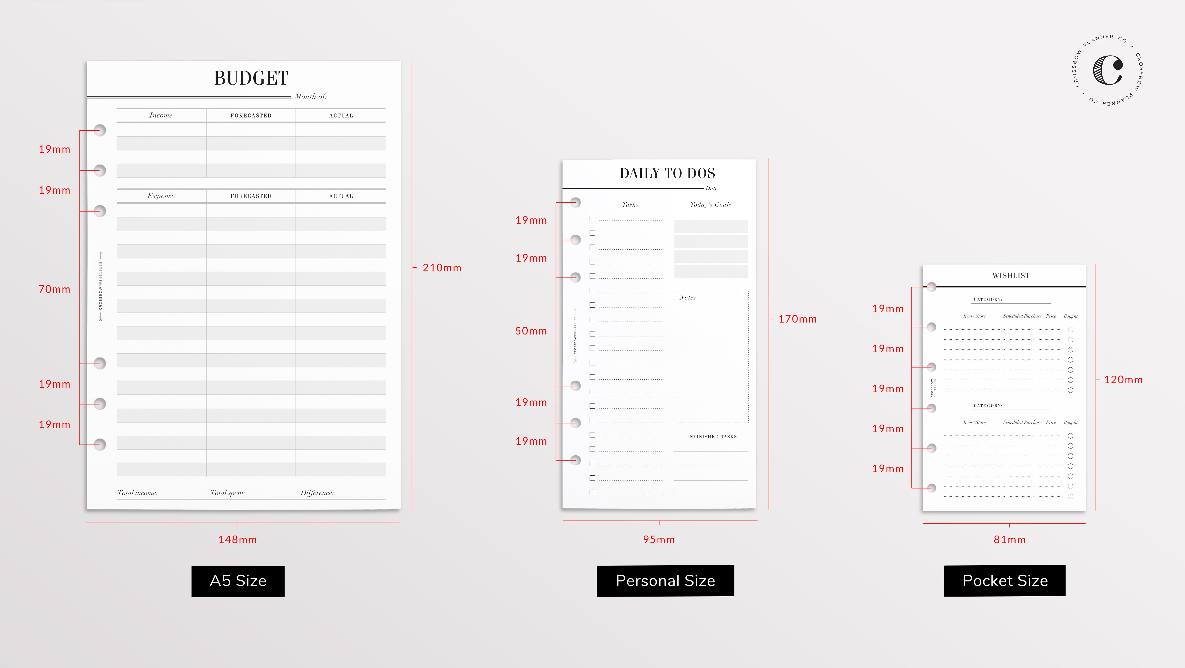 We currently stock A5, personal and pocket size as 6-ring printed inserts. But, if you're looking for A6 or Personal Wide inserts, or would like unpunched A5 versions of our inserts to use in a discbound planner, consider using our printable versions which you can print yourself at home, or at a local print shop.