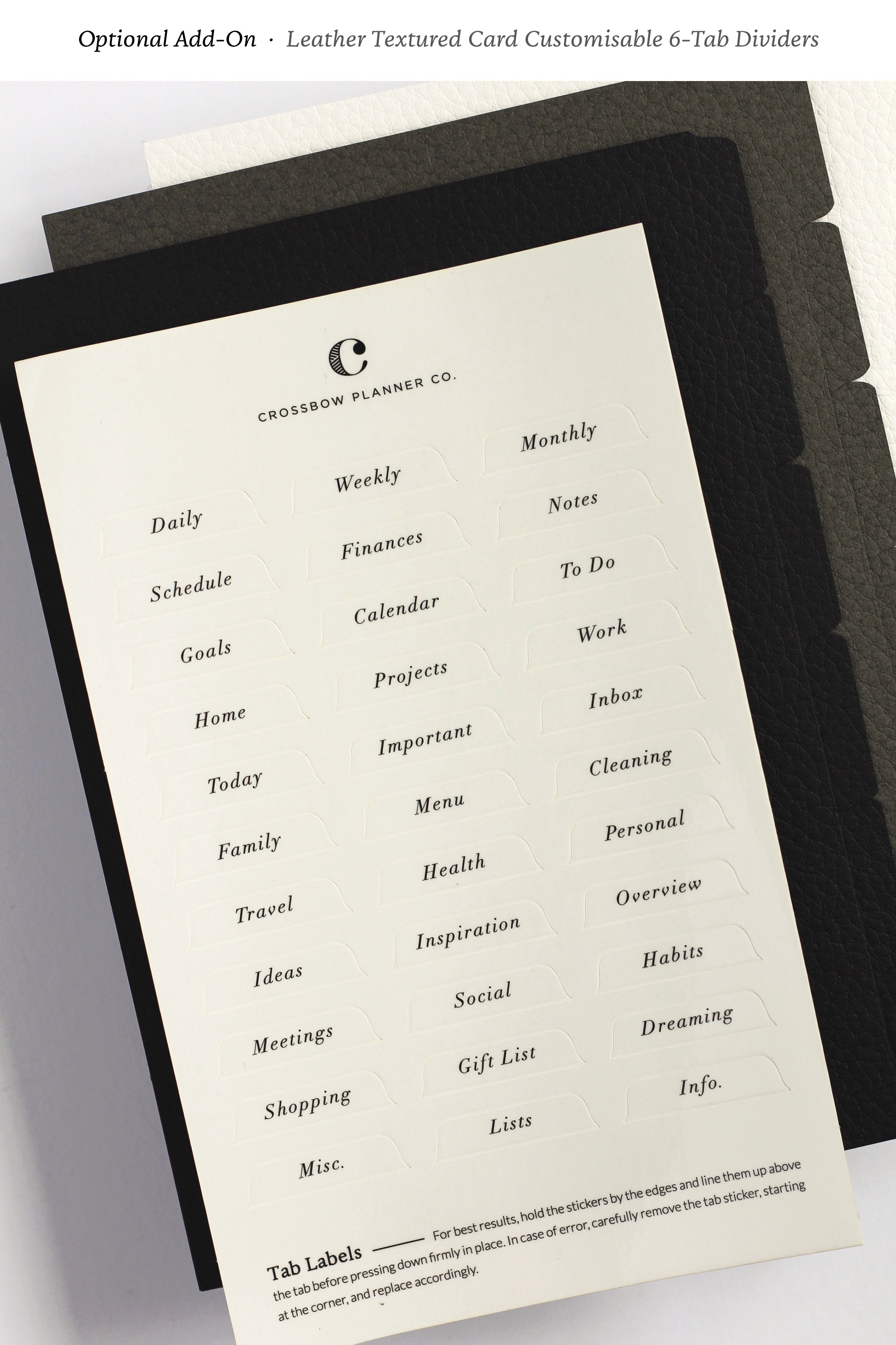 • Optional add-on - Leather Textured Card 6-Tab dividers with tab label sticker sheet. Choose from Alabaster (Ivory), Pebble (Grey) or Black. For full divider details, please see here.